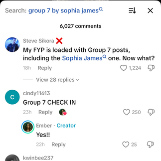One of TikTok’s defining stylistic traits is context collapse: the erasure of narrative continuity between videos. A user may see a response to a meme before seeing the original post, forcing them to reconstruct meaning in reverse. “Group 7” flourished within this dynamic. Many users first encountered “response” videos like people welcoming others to the group, joking about its mystique, before ever seeing James’s initial post.